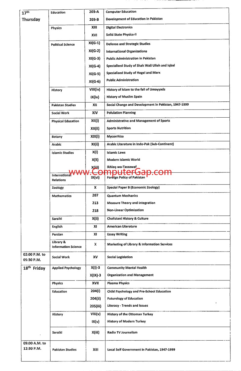 | Date Sheet of M.A / M.Sc 2nd Annual 2017 Held in May 2018 IUB Islamia University Bahawalpur |